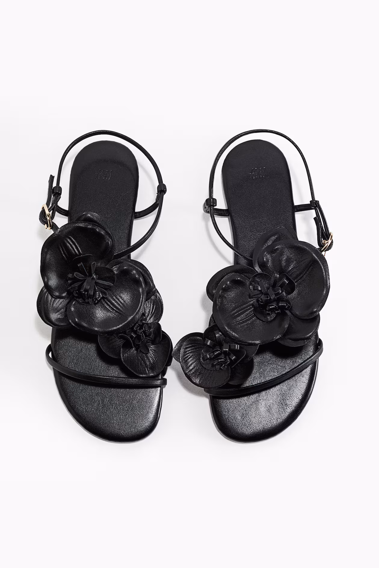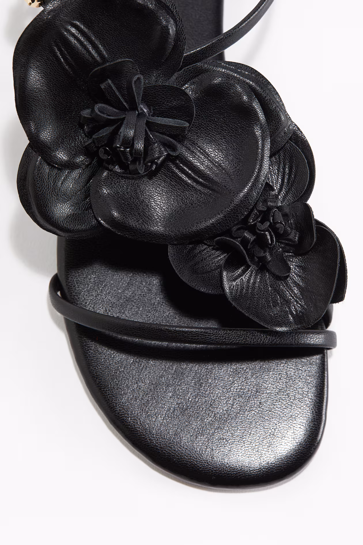 Strappy sandals in coated fabric with rounded toes and large floral appliqués over the foot. Narrow, adjustable ankle strap with an oval metal buckle.