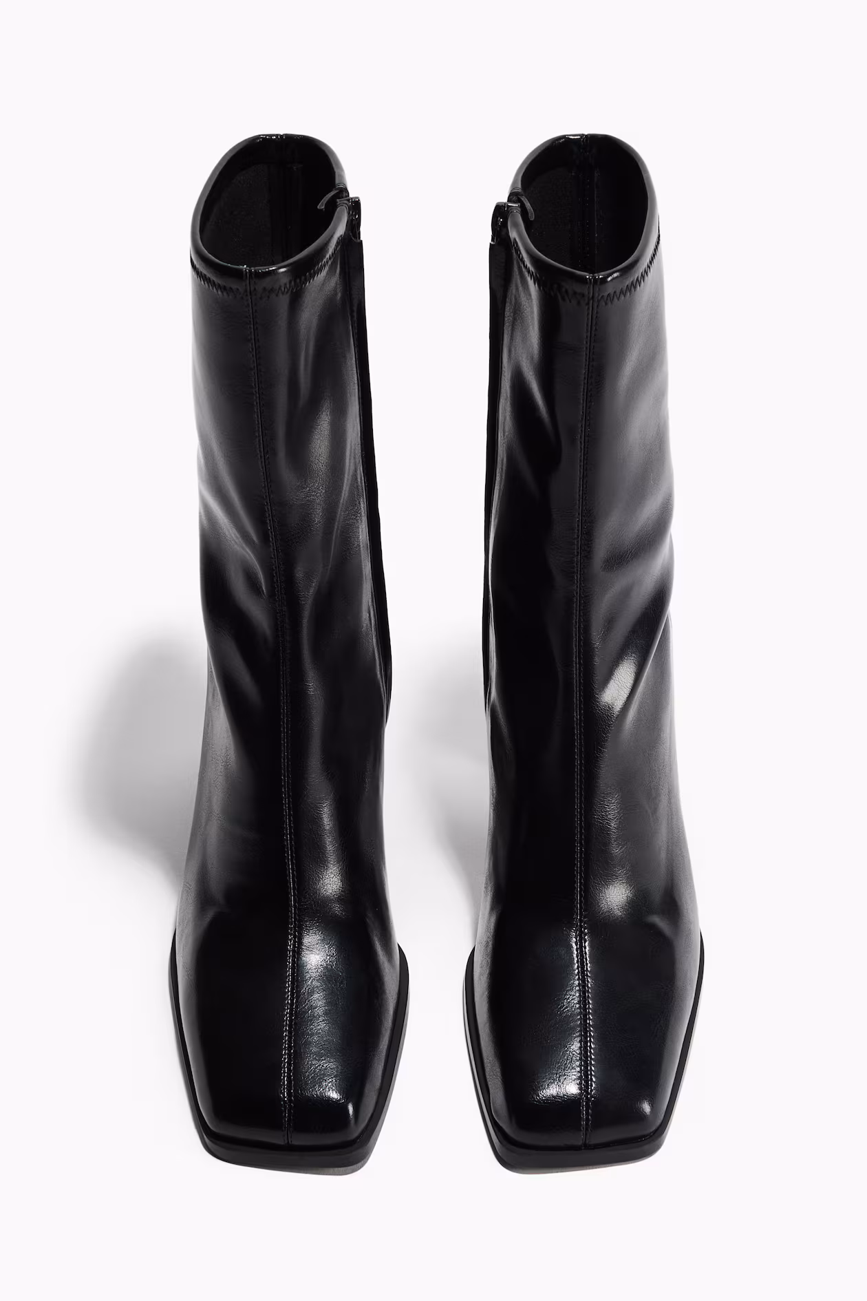 Ankle boots in coated fabric with a visible vertical seam at front. Square toes, concealed zipper at one side, and covered block heels. Lining and insoles in jersey.