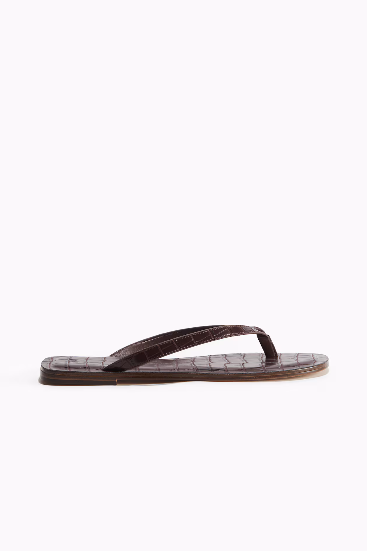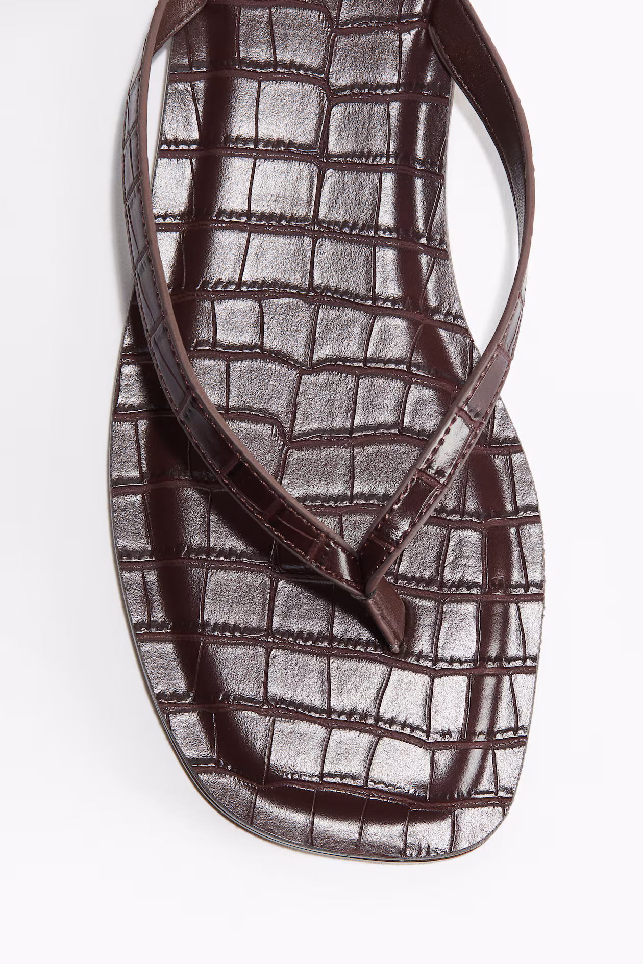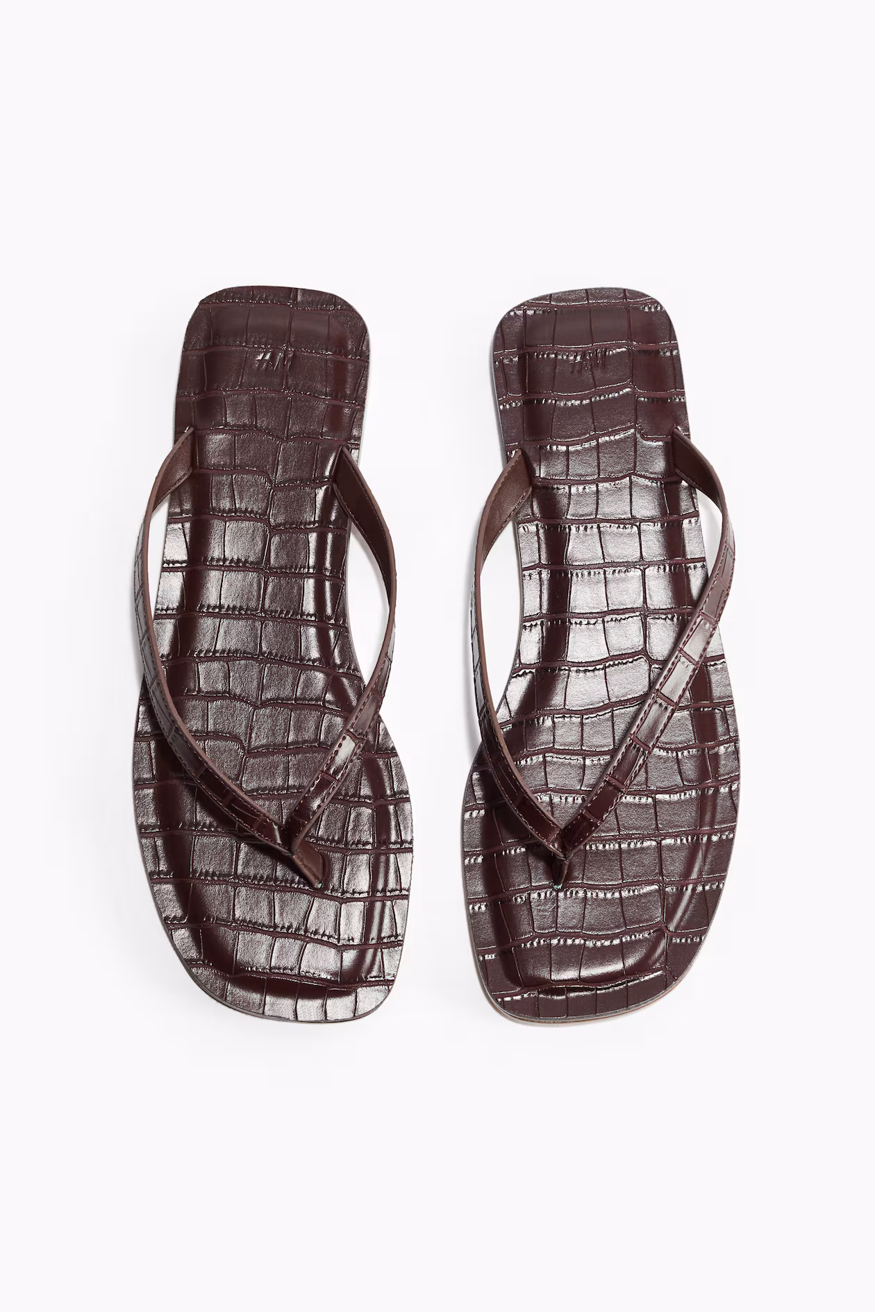 Flip-flops in embossed, coated fabric with square toes. Lightly padded insoles.