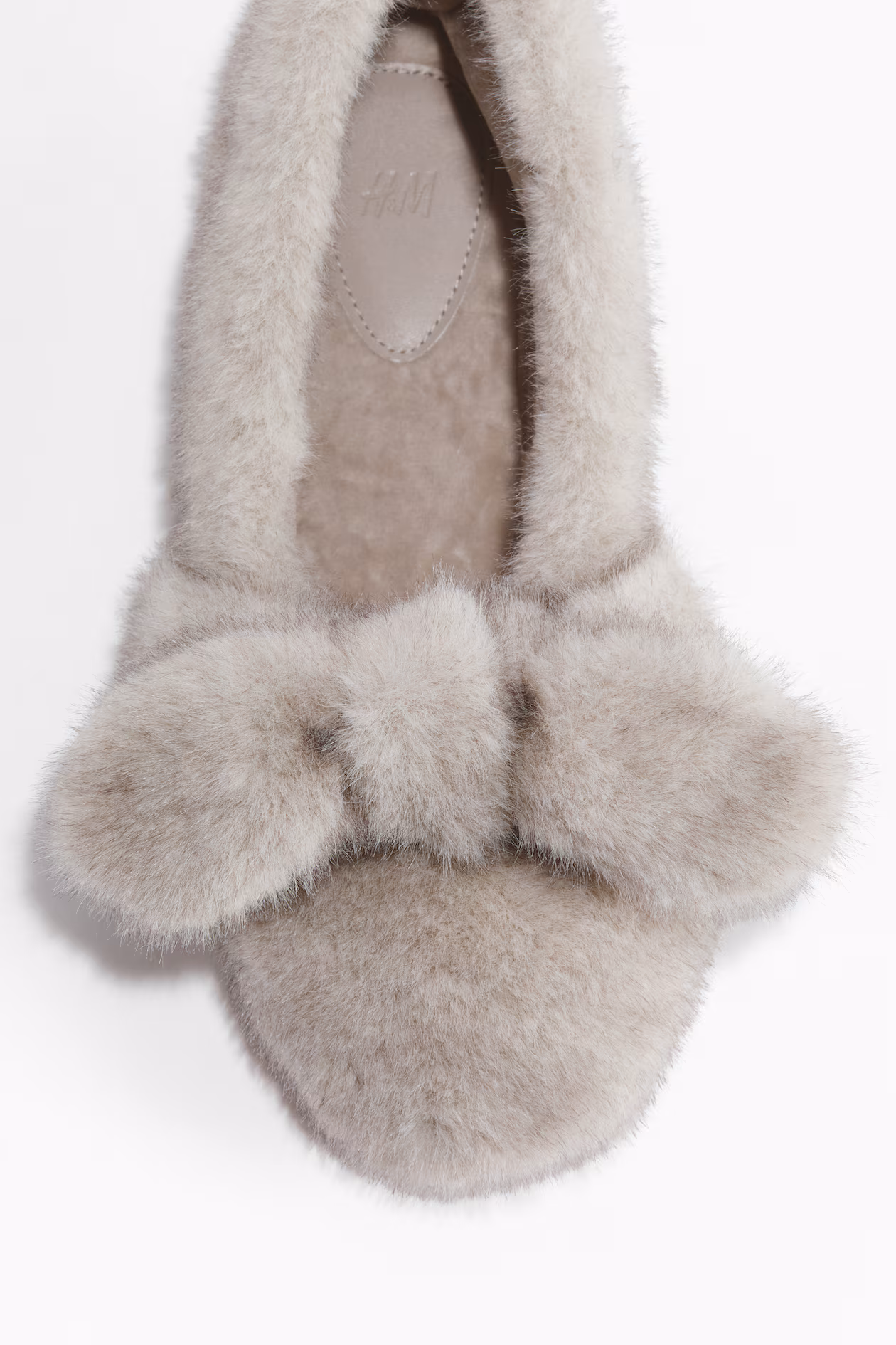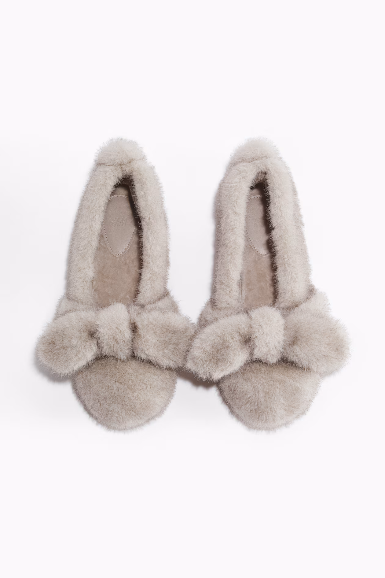 Slippers in soft, fluffy fabric with a bow at front and a pompom at back. Lining and insoles in velour.