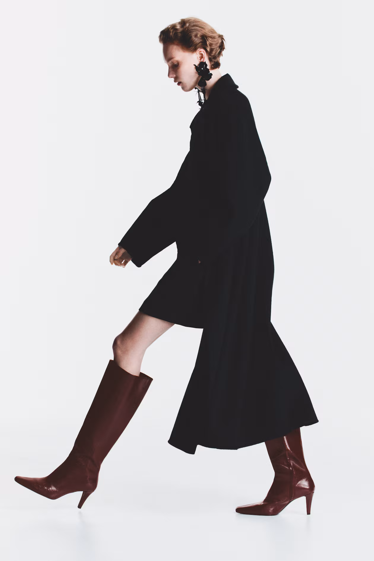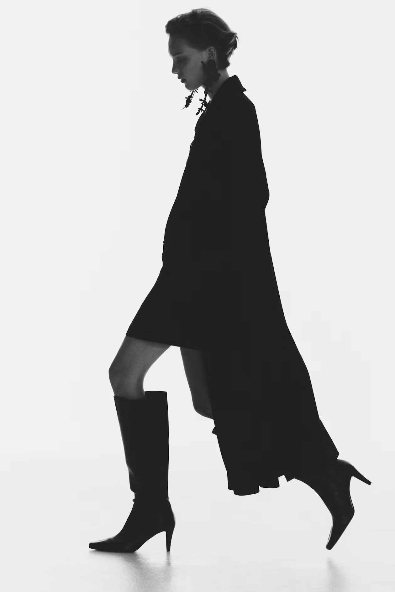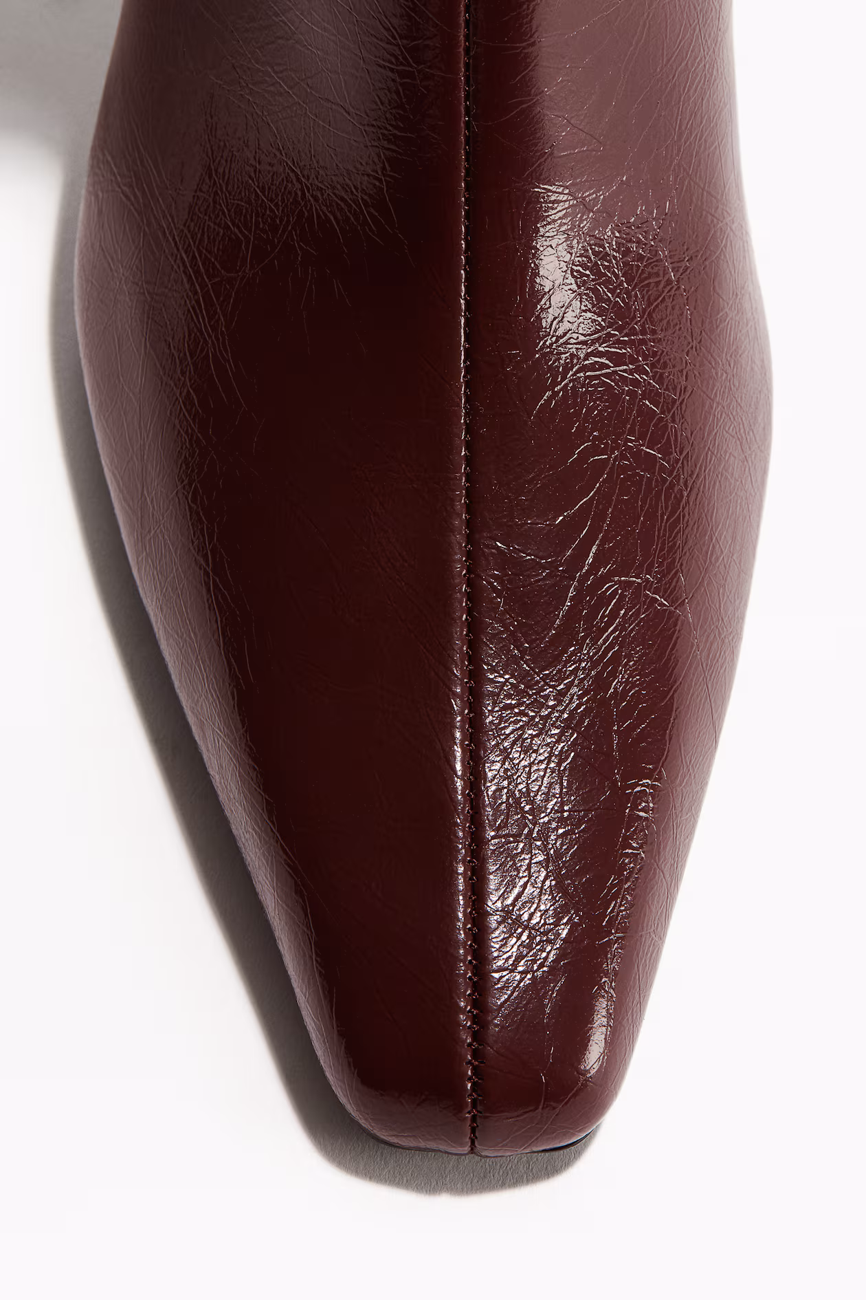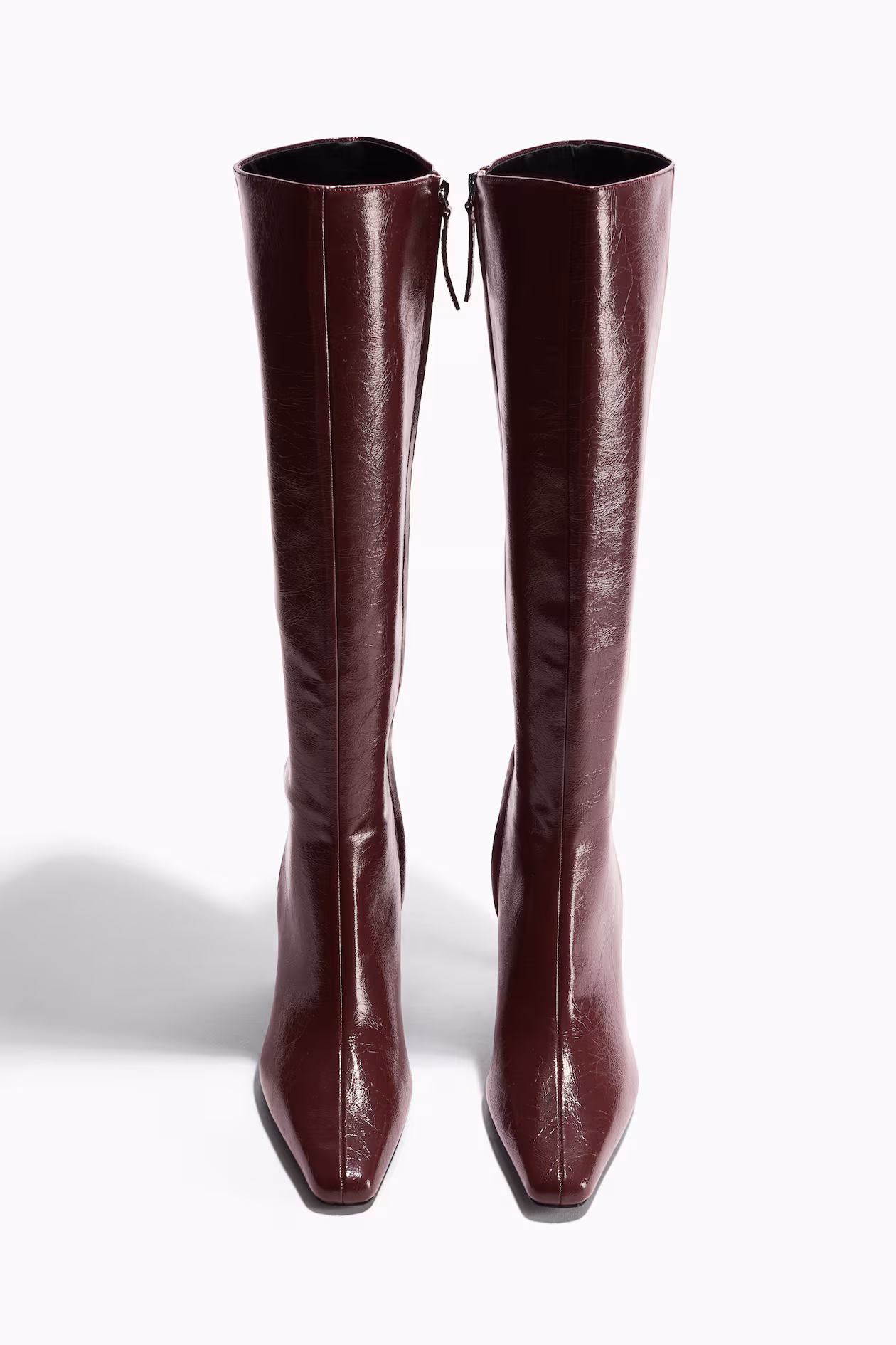 Knee-high boots. Chisel toes, concealed zipper at one side, and narrow, covered heels. Satin lining.