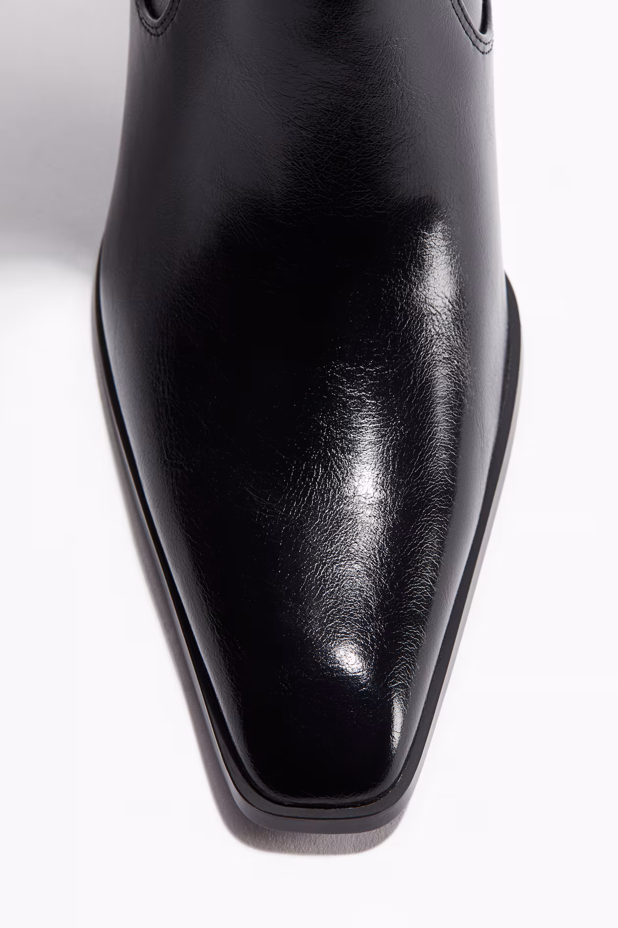 Heeled, knee-high boots in coated fabric. Chisel toes, stretchy legs with a zipper at one side, jersey lining, and jersey insoles.