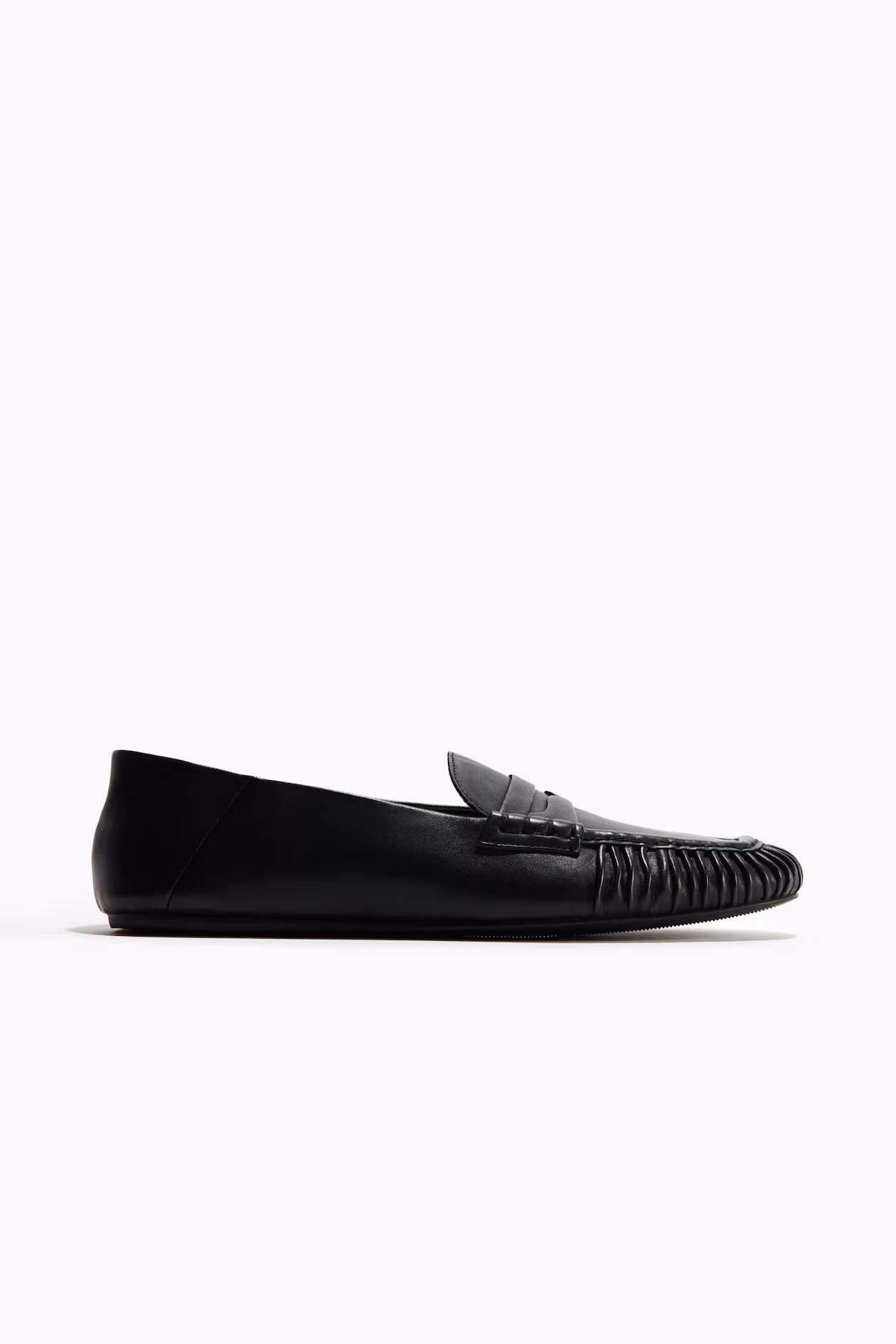 Loafers in soft leather with a penny keeper and a moccasin seam at front with gathers. Jersey lining and leather insoles.