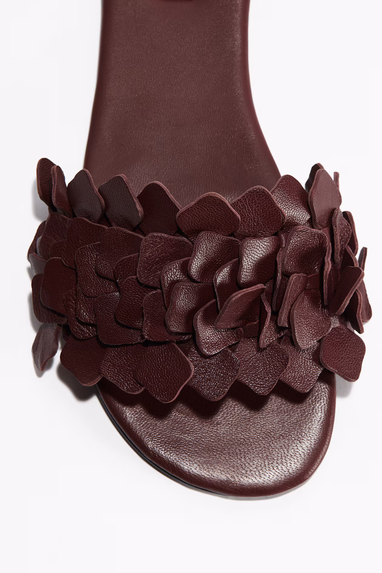 Sandals in leather. Rounded toes and a wide foot strap with petal-look accents. Leather lining and leather insoles.