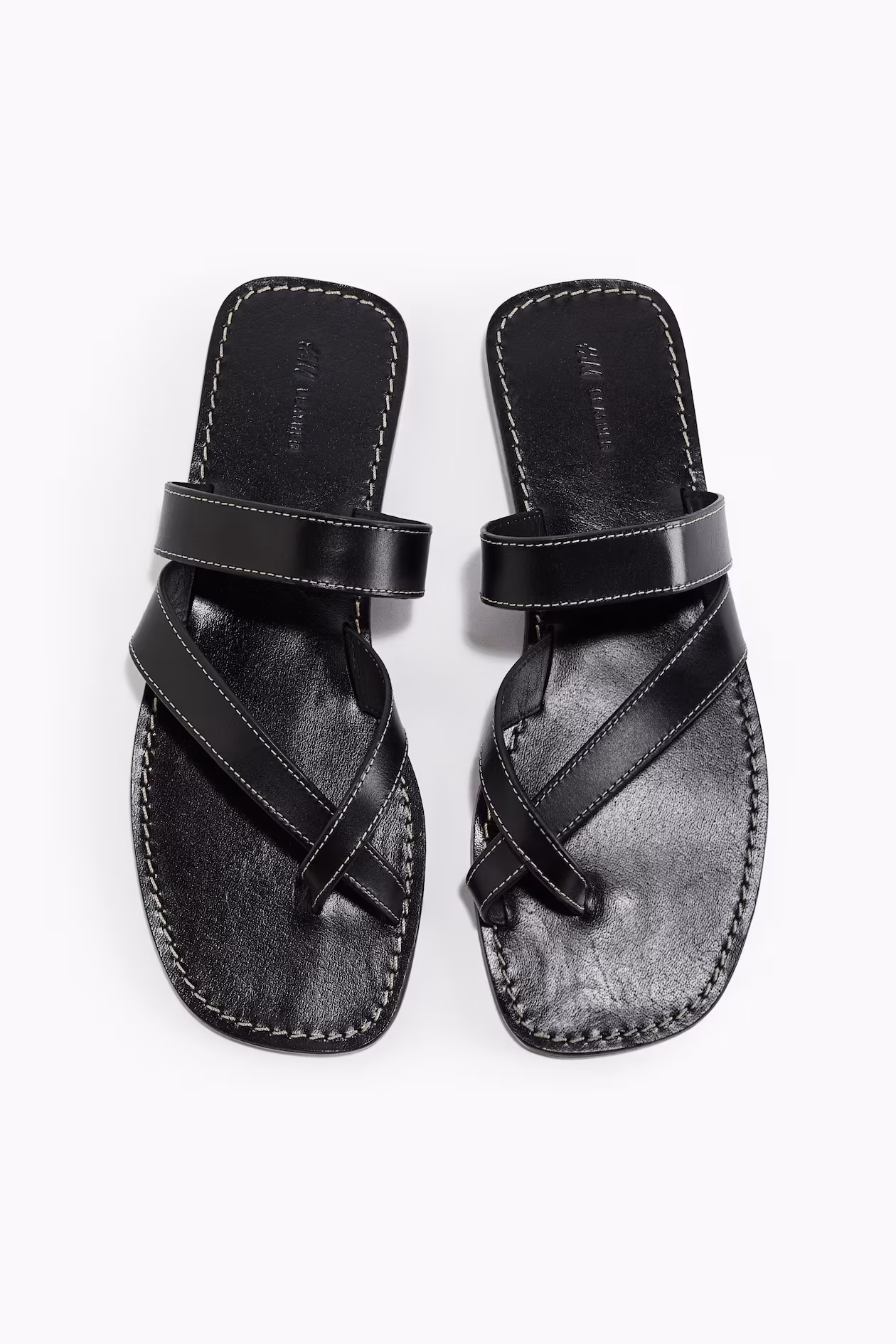 Flat sandals in leather with contrasting stitching. Square toes and crossover foot straps that form a toe loop.