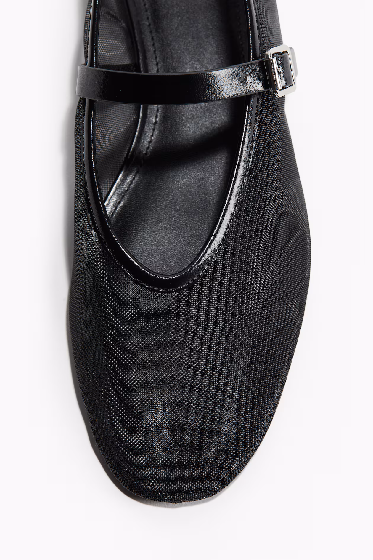 Mary Jane-style flats in mesh with trim in coated fabric. Rounded toes and a narrow, adjustable foot strap with metal buckle.