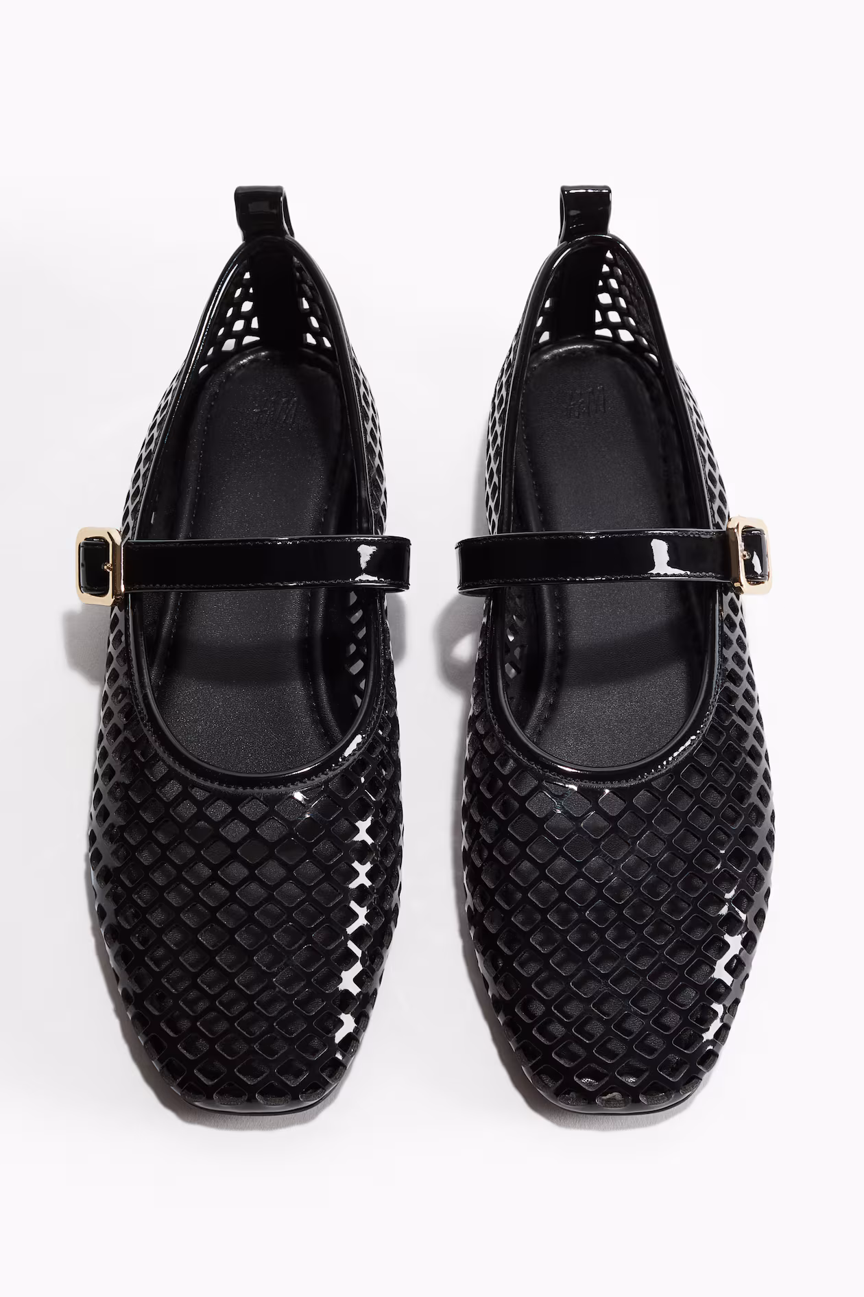 Perforated Mary Jane-style ballet flats in coated fabric. Rounded toes, adjustable foot strap with metal buckle, and a loop at back.