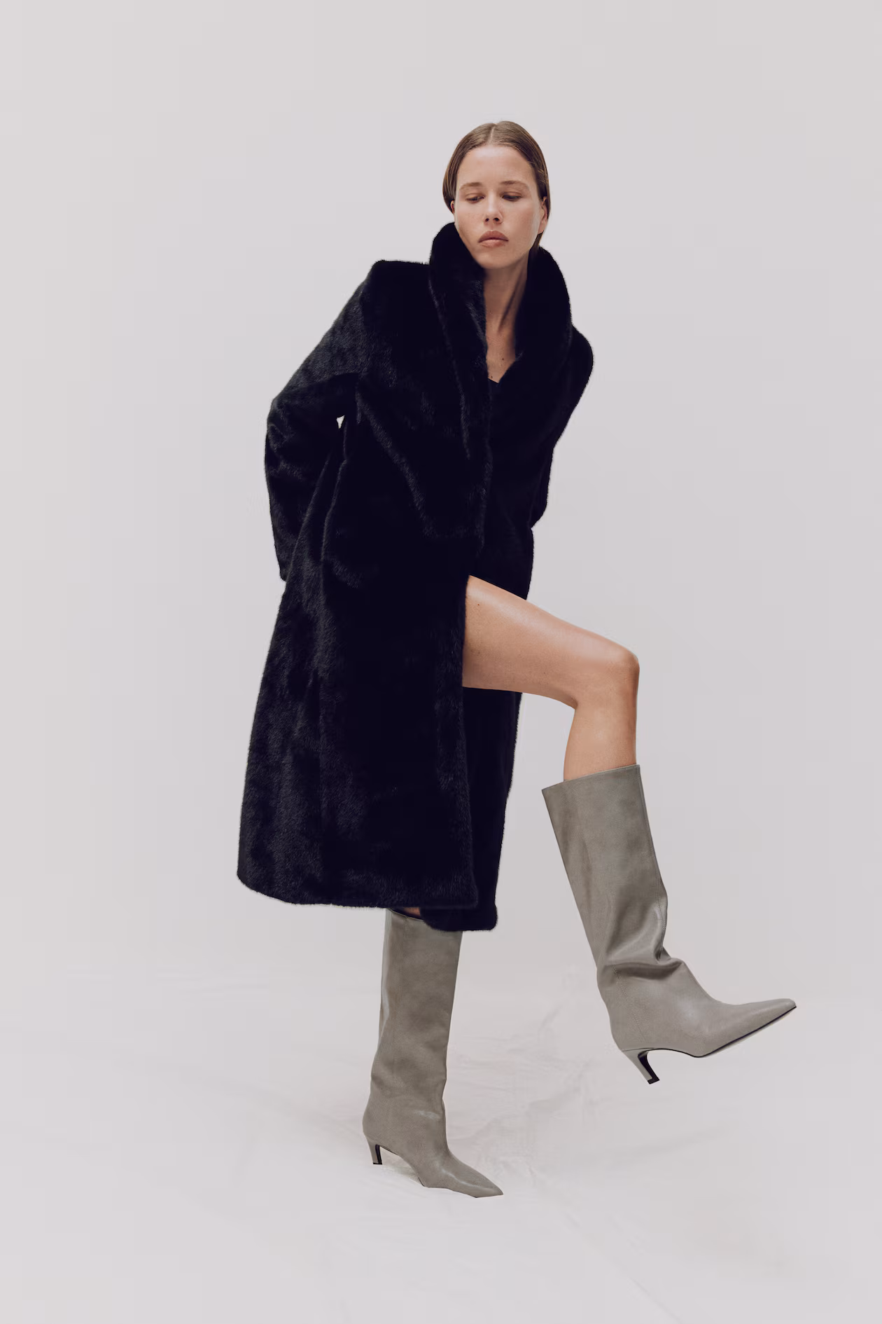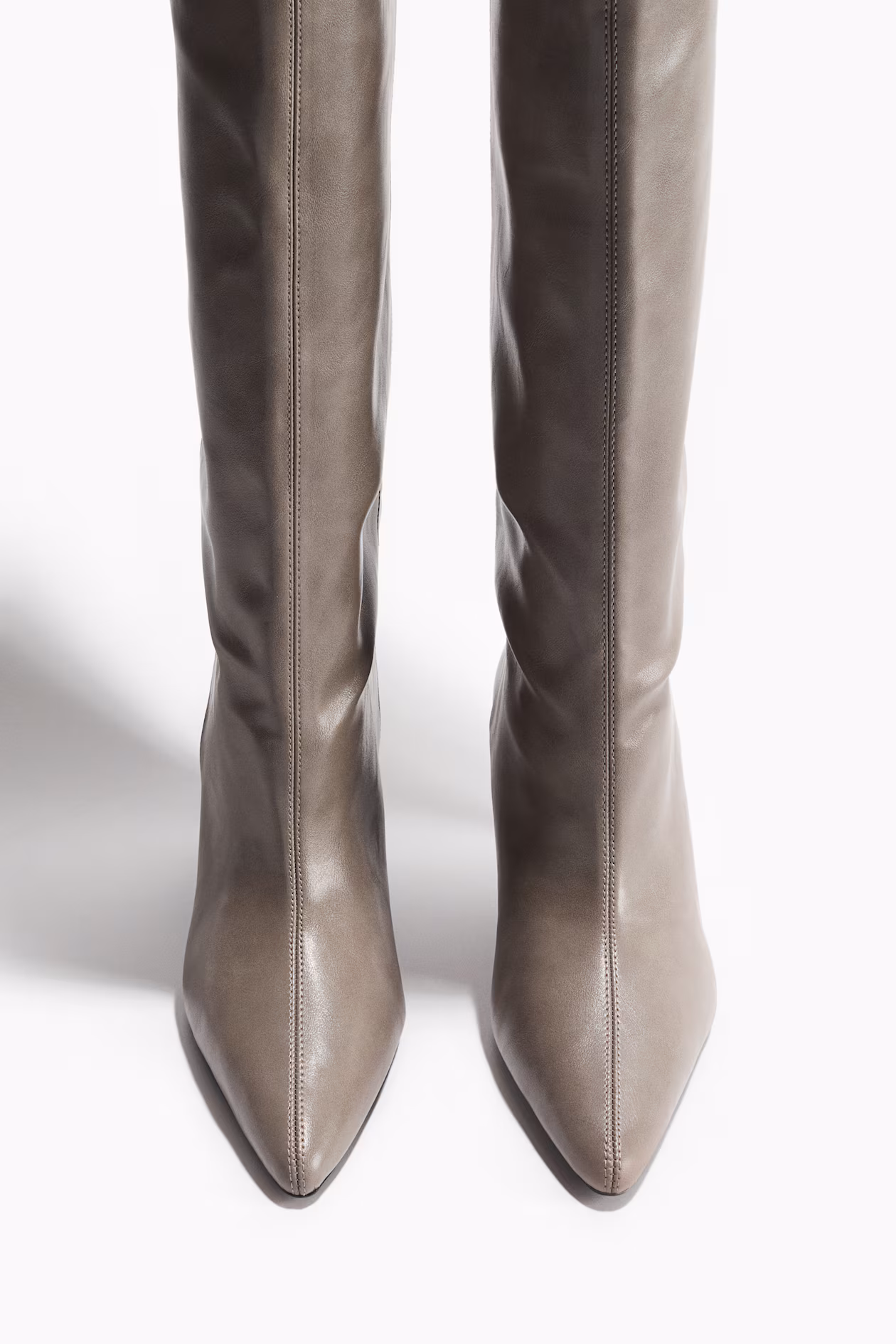 Knee-high boots with pointed toes and partially covered kitten heels. Lining and insoles in jersey.