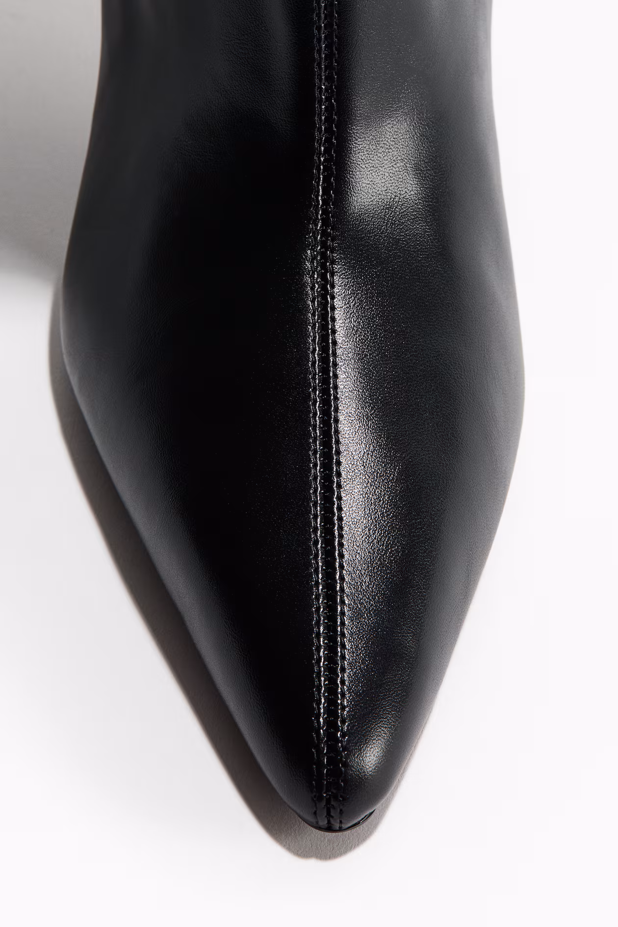 Knee-high boots with pointed toes and partially covered kitten heels. Lining and insoles in jersey.