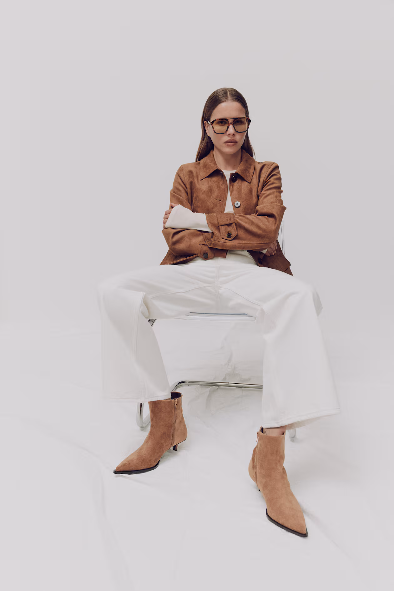 Ankle boots with pointed toes, partially covered kitten heels, and a zipper at one side. Satin lining.