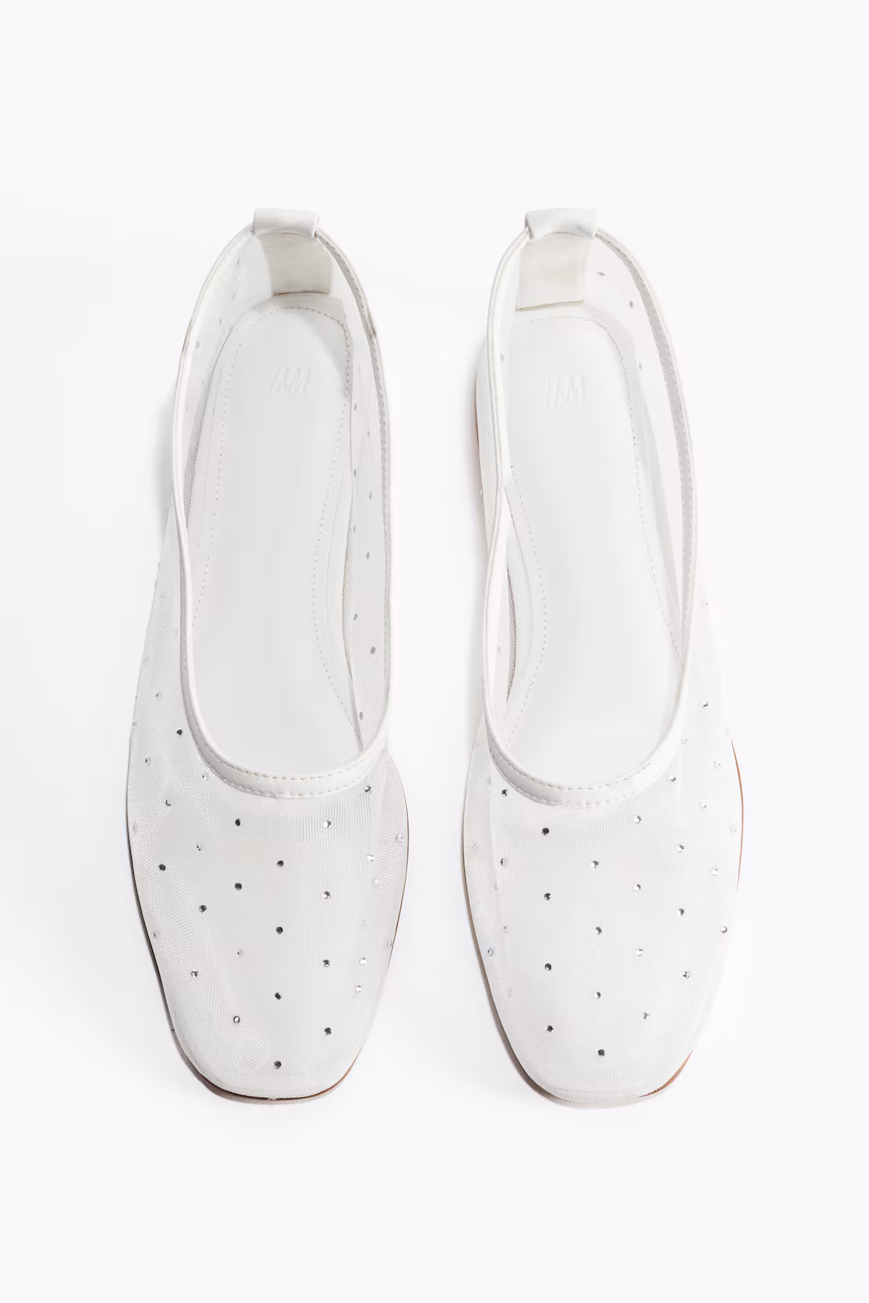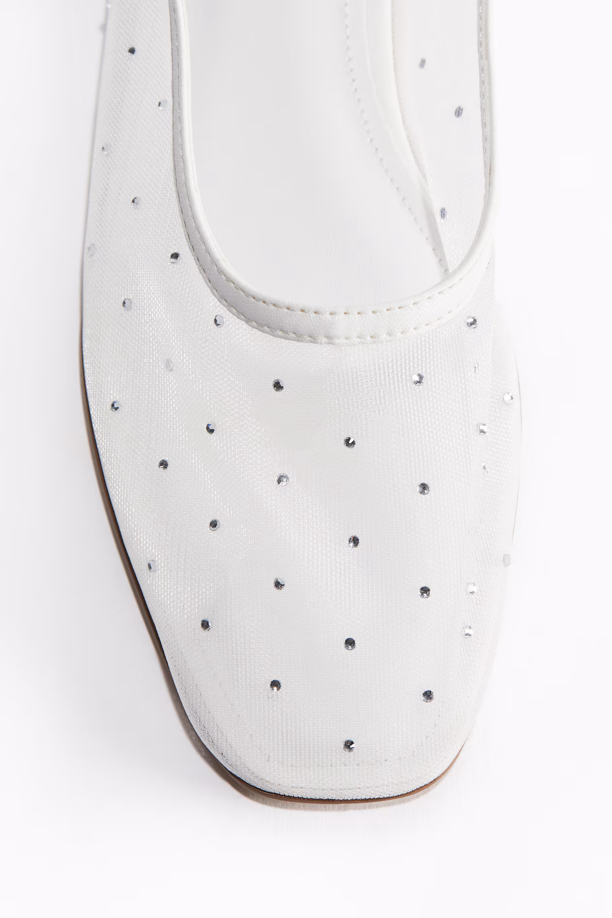 Ballet flats in mesh with sparkling rhinestones. Square toes, opening with binding in coated fabric, and a loop at back.