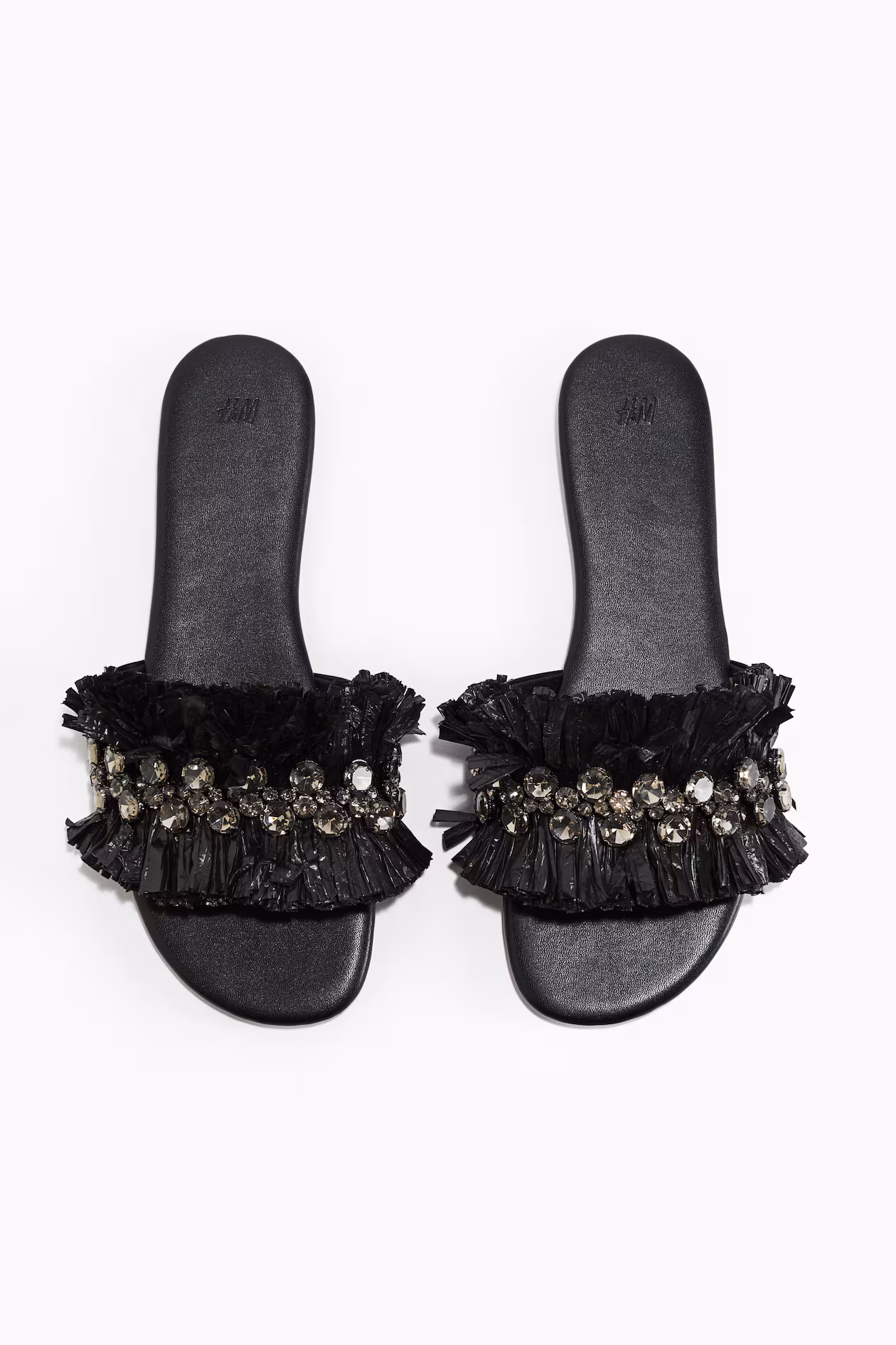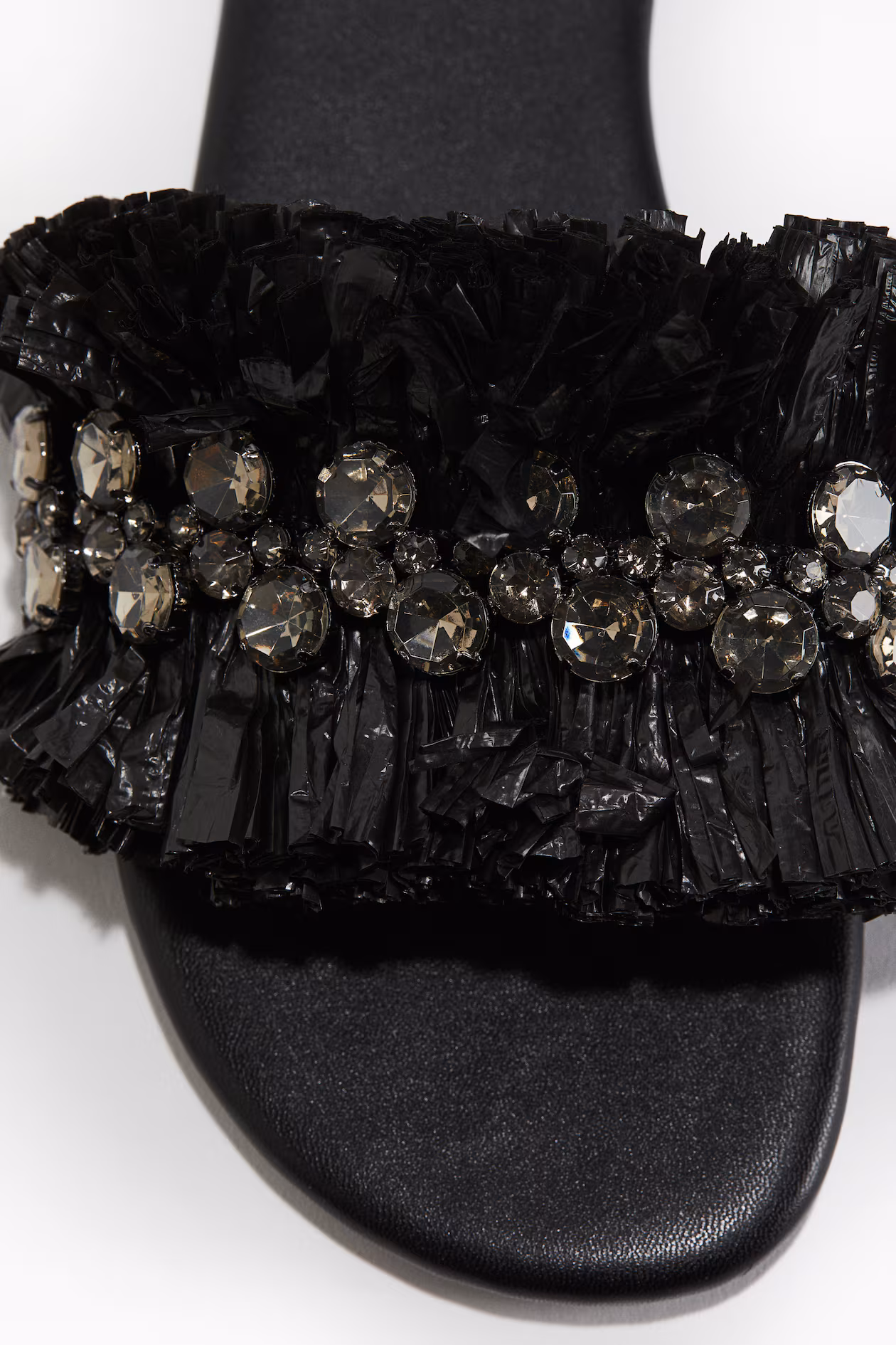 Sandals in coated fabric with rounded toes. Wide foot strap with plastic straw and sparkling rhinestones. Jersey lining.