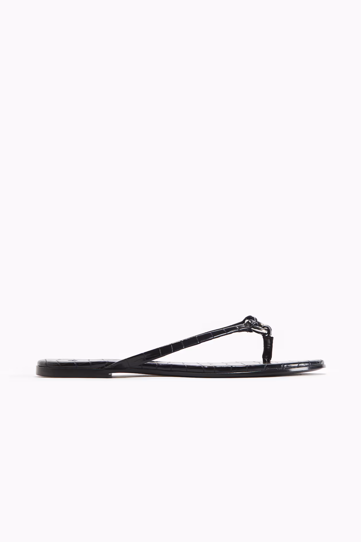 Flip-flops in coated fabric with rounded toes. Narrow foot straps attached to a chunky metal ring at front.
