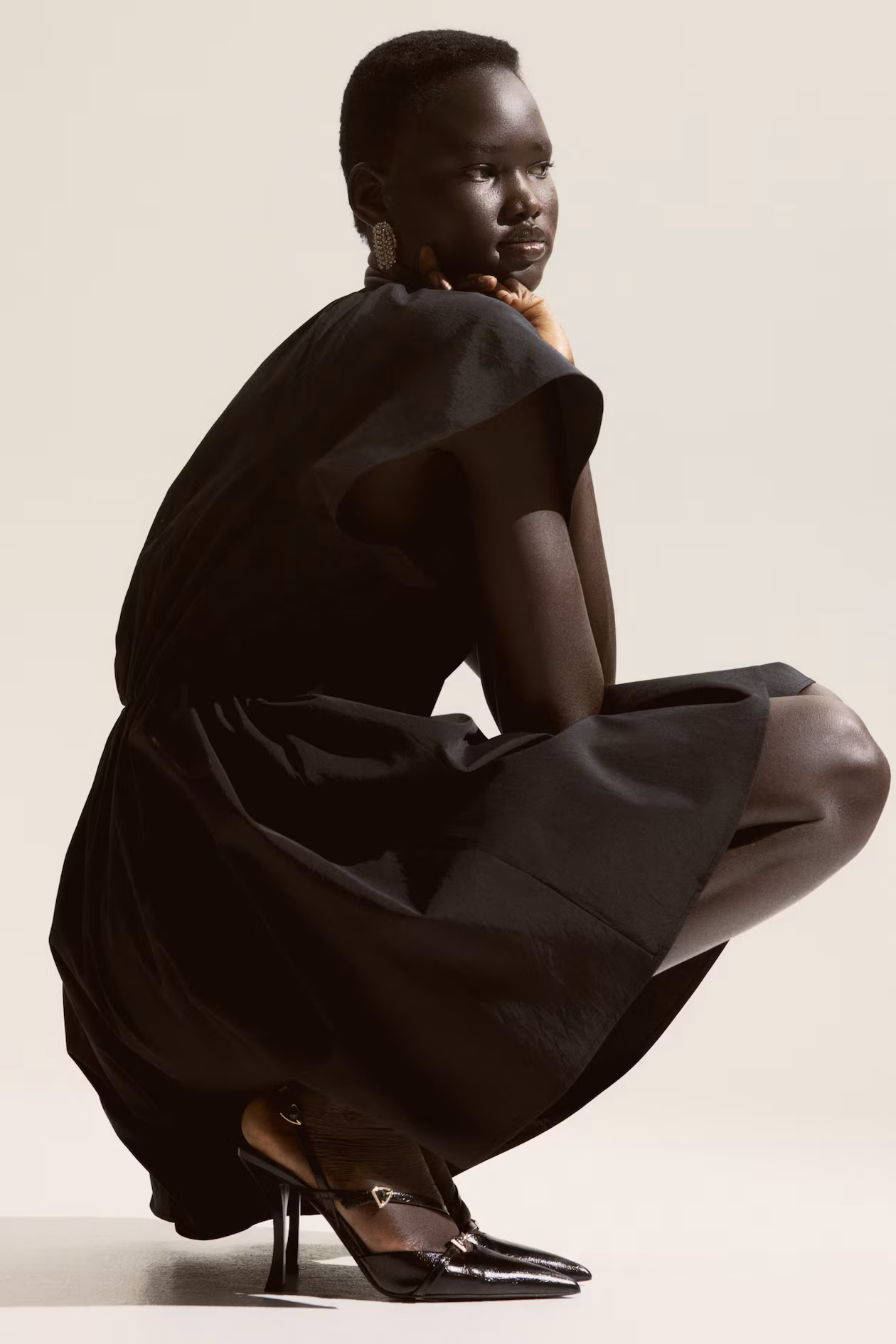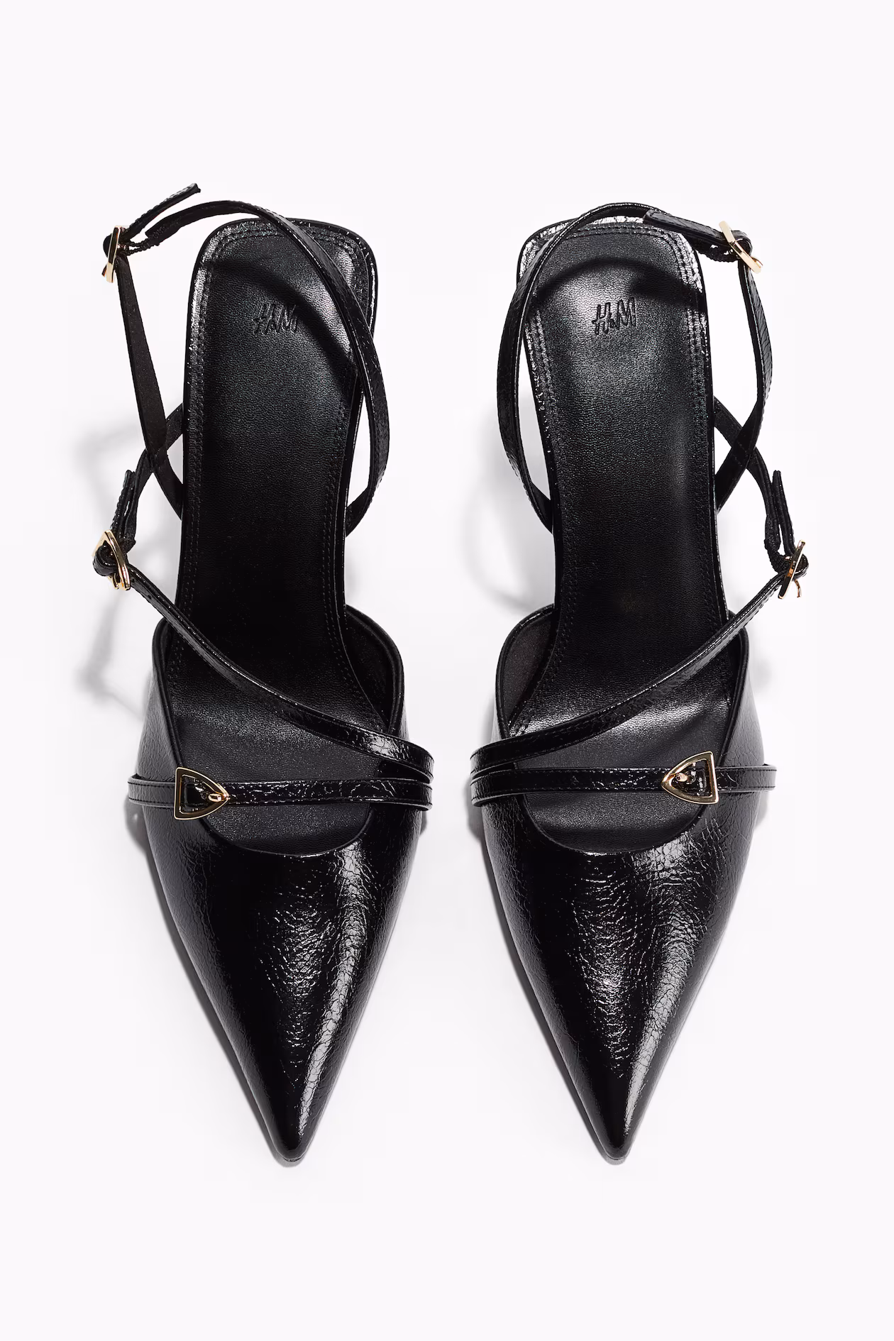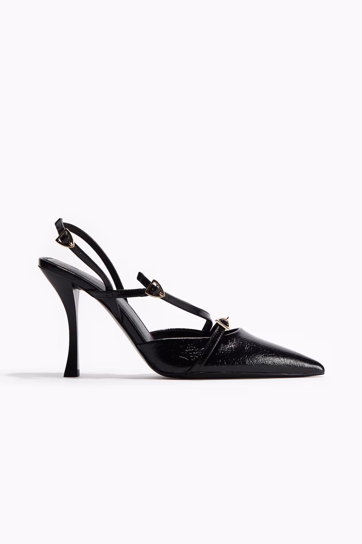 Slingback pumps in coated fabric with pointed toes and narrow heels. Adjustable foot and heel straps with triangular metal buckle. Satin lining.