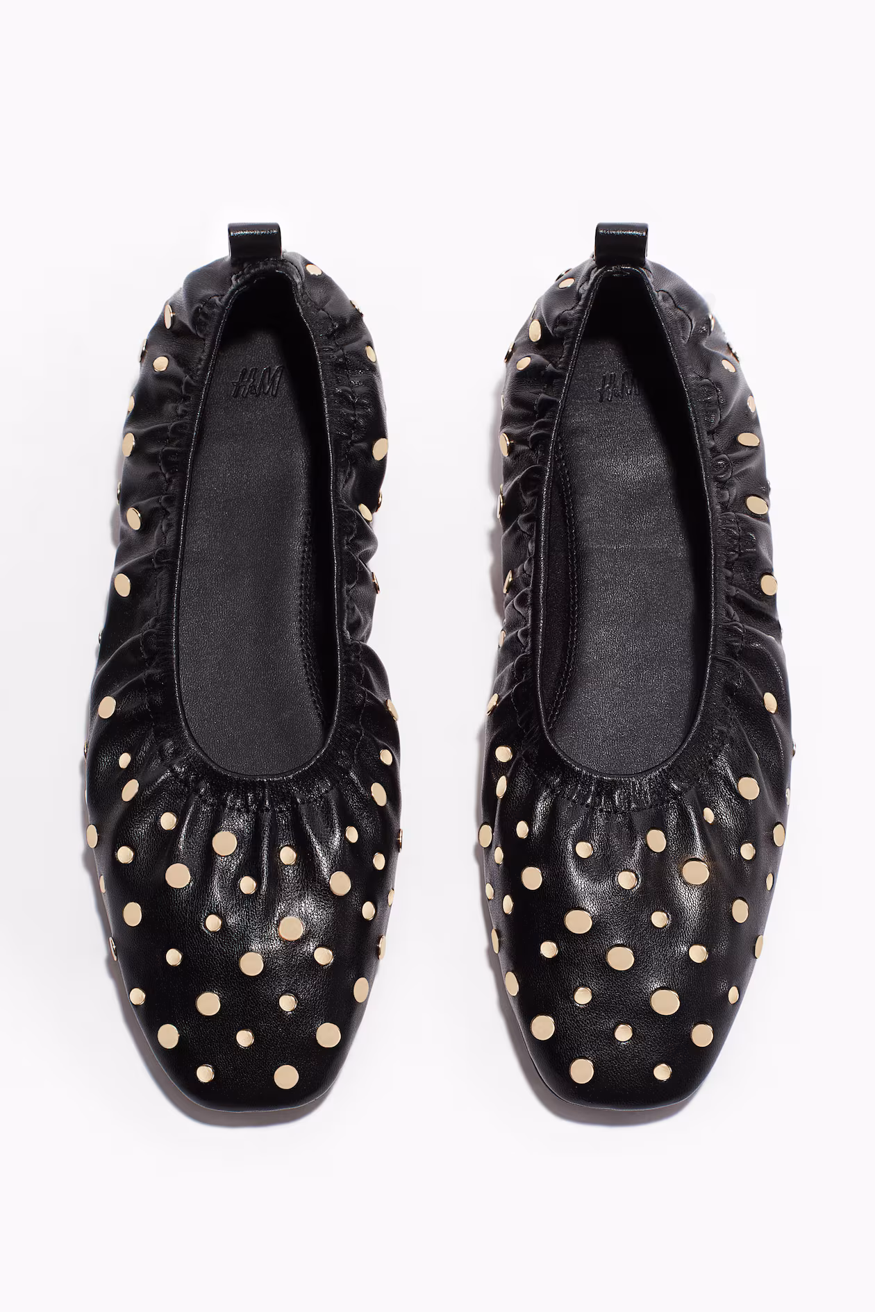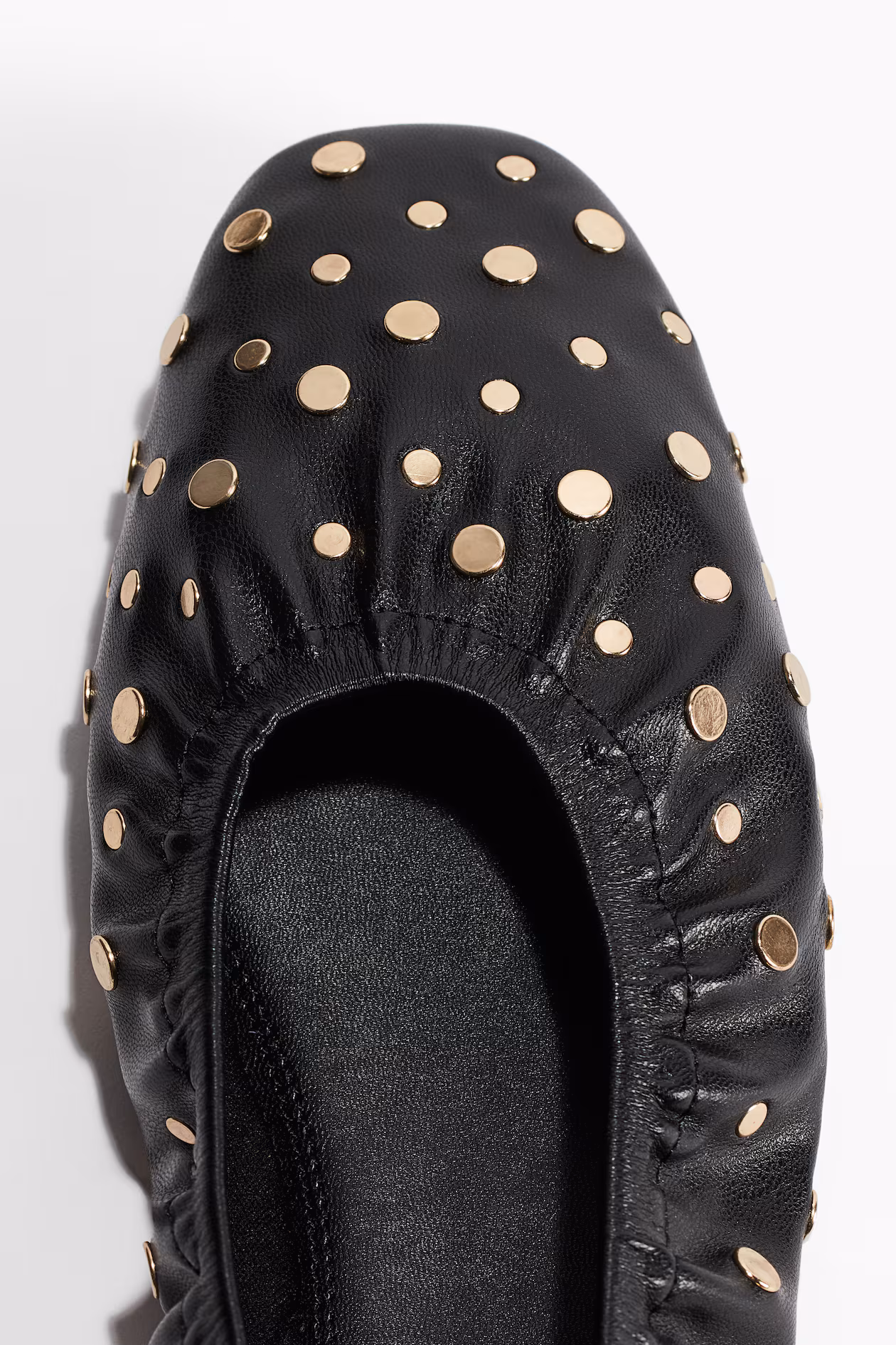 Coated ballet pumps embellished with flat metal studs. Chisel toes, narrow elastication around the opening and a loop at the back. Jersey linings. Heel 0.6 cm.
